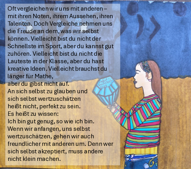 Die Kunstrichtung Expressionismus ist Ausgangspunkt dieses Bildes. Sarah hat verschiedene Bildzitate eingebracht und macht hier das Gefühl der Orientierungslosigkeit und die Flucht in Alkohol durch starke Farben und Raumveränderungen emotional deutlich.