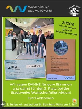Unsere Schule hat den zweiten Platz geschafft, das bedeutet, dass wir nun eine Zuwendung von 2000.- Euro erhalten, um ein weiteres Klassenzimmer im Grünen auf dem Schulgelände zu errichten. Nun geht es in den Ausschreibungsprozess.